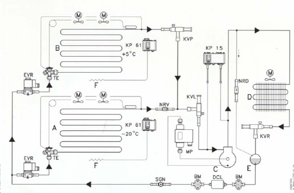 Una válvula de retención NRV es colocada en la línea de succión proveniente del evaporador de baja temperatura A. La válvula previene un retorno de refrigerante en el evaporador de baja temperatura durante los períodos que el compresor esta apagado.